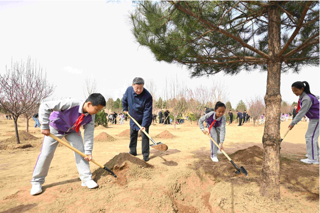 挥锹铲土、培土围堰、提水浇灌……习近平接连种下油松、北京牡丹、榆叶梅、杜仲、元宝枫等多棵树苗。他一边植树,一边询问孩子们的学习生活、劳动锻炼和参加植树情况。习近平强调,青少年像小树苗一样充满活力和希望,要从小树立远大志向,爱知识、爱劳动、爱自然,德智体美劳全面发展,努力成长为栋梁之材。现场气氛热烈,一派繁忙景象。