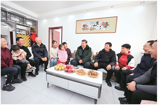 2025年1月22日至24日,中共中央总书记、国家主席、中央军委主席习近平冒着严寒来到辽宁,看望慰问基层干部群众。这是22日下午,习近平在葫芦岛市绥中县明水满族乡祝家沟村考察时,同村民王宝维一家围坐一起拉家常。 新华社记者 谢环驰/摄