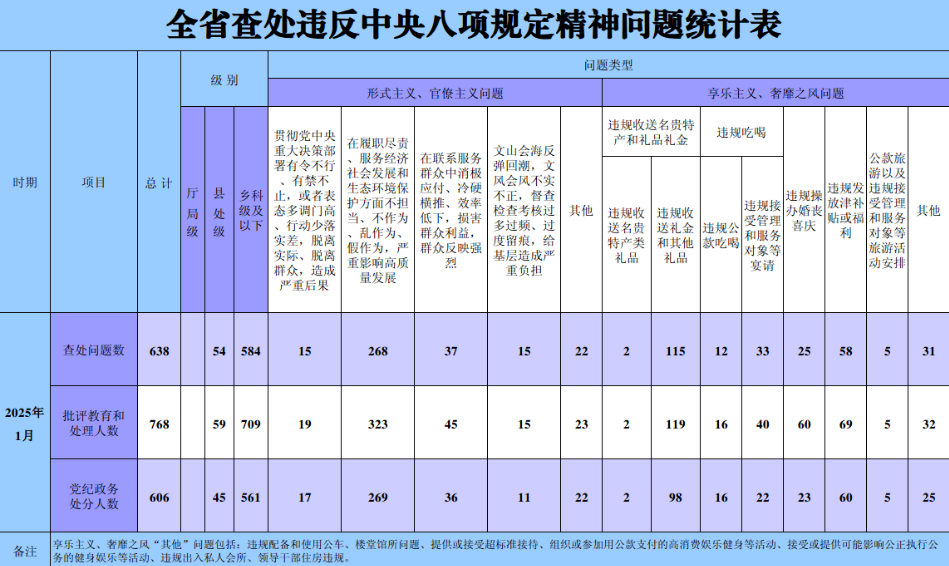 2025年1月,黑龙江省纪检监察机关共查处违反中央八项规定精神问题638起,批评教育和处理768人,其中党纪政务处分606人。