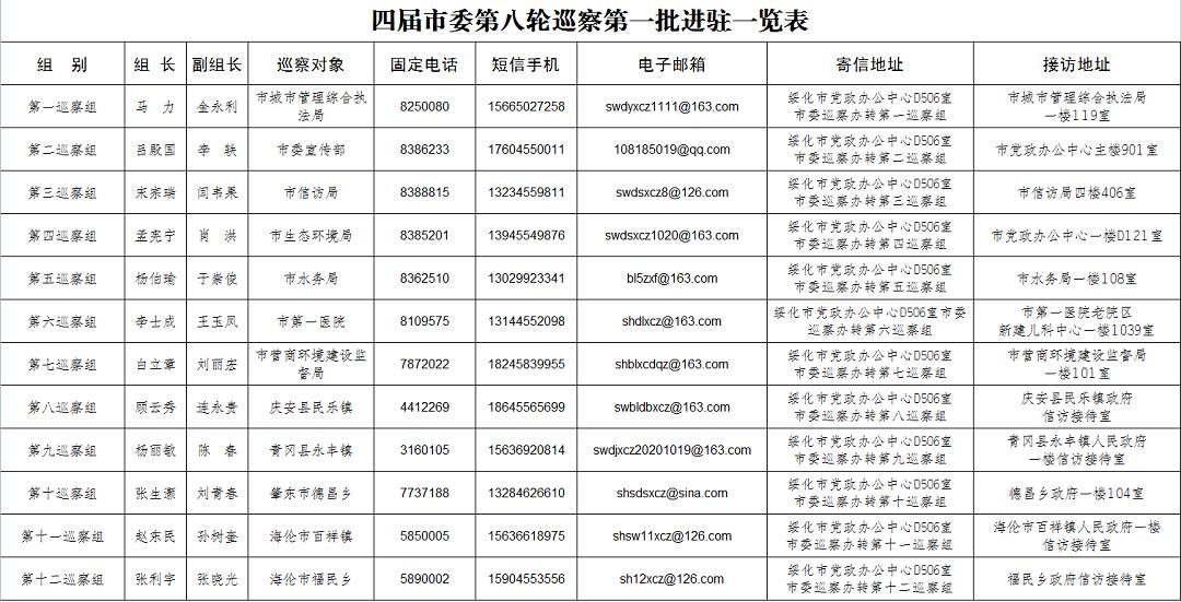 经市委批准,四届市委第八轮巡察工作组建12个巡察组,对14家单位党组织和10个乡(镇)党委开展巡察。10月22日,市委第一至第十二巡察组已分别进驻市城市管理综合执法局、市委宣传部、市信访局、市生态环境局、市水务局、市第一医院、市营商环境建设监督局、庆安县民乐镇、青冈县永丰镇、肇东市德昌乡、海伦市百祥镇、海伦市福民乡。