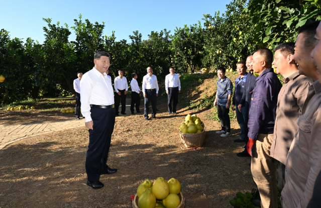11月7日至8日,中共中央总书记、国家主席、中央军委主席习近平在广东考察。这是7日下午,习近平在梅州市梅县区雁洋镇南福金柚种植基地考察。 新华社发(肖翊 摄)
