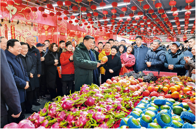 2025年1月22日至24日,中共中央总书记、国家主席、中央军委主席习近平冒着严寒来到辽宁,看望慰问基层干部群众。这是23日上午,习近平在沈阳大东副食品商场考察时,同店主和顾客亲切交流。新华社记者王晔/摄